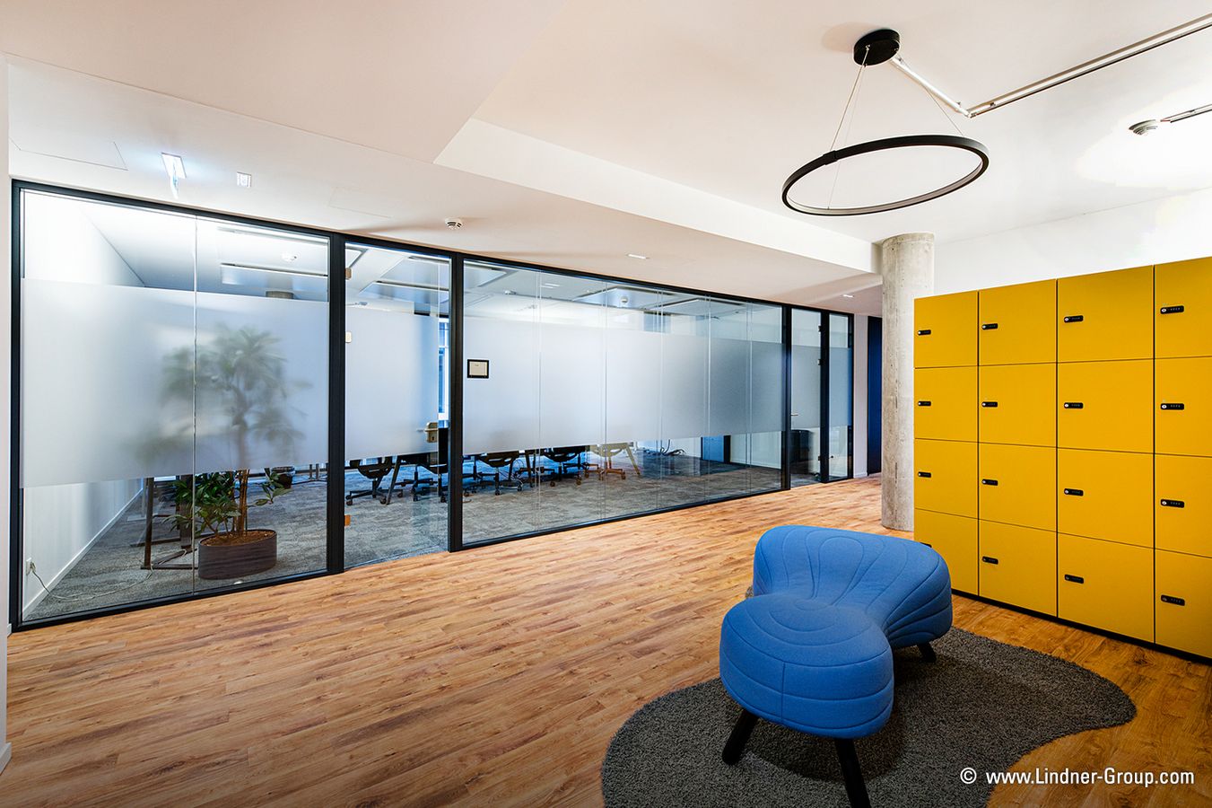Les aménagements des locataires peuvent être si différents et pourtant si similaires : des prestations d’aménagement classiques ont été réalisées pour les deux locataires, et des systèmes de cloisons ont été utilisés dans chaque cas. Un aspect bois chaleureux combiné à beaucoup de gris et de noir se retrouve également dans les deux projets. Cependant, les différences peuvent être observées principalement dans la conception et les produits utilisés : alors qu’Expertum mise beaucoup sur le vert, Prodware utilise principalement des éléments bleus et jaunes – correspondant aux couleurs de l’entreprise. Les pièces du groupe Expertum ont été conservées dans un style industriel moderne, incarné par le Lindner Life Industrial avec un cadre noir et des murs d’aspect brique. L’aménagement locatif de Prodware, en revanche, a un aspect plus sobre et impressionne par son élégance simple, par exemple avec la cloison en verre Lindner Life Clear.